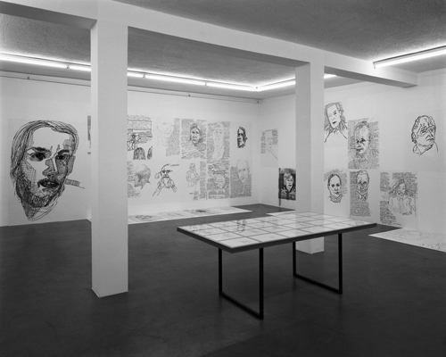 Space-filling wall and floor work in the main room of the gallery. Portraits of lecturers surrounded by text components from the fields of art, architecture, cultural and natural science.